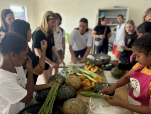 Visitors from Thrive (back) help moms from Katutubo Village (front) prepare a vegetable dish for the day’s meal.