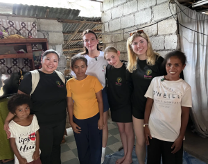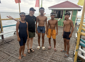 Heidi Gunderson with members of the Dawahon swim team, wearing goggles donated by Dr. Gunderson.