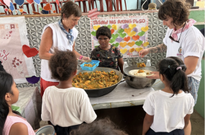 Gina (left) with kids from Katutubo Village and Heidi Gunderson (right, back). Thrive mother Soraya (right, front) prepares rice traditionally cooked in bamboo over fire.