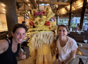 Gina and Heidi with a lion dancer making the rounds for Chinese New Year celebrations at the Bellevue Resort