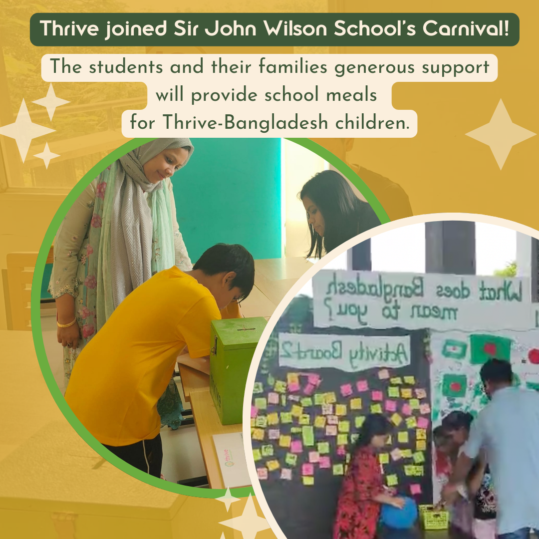 Thrive recently participated in Sir John Wilson School’s Carnival, where the generosity of students and their families will help provide nutritious school meals to children in Bangladesh. Special thanks to Sabrina Shaheed for granting us a carnival stall, which was key to our success.
